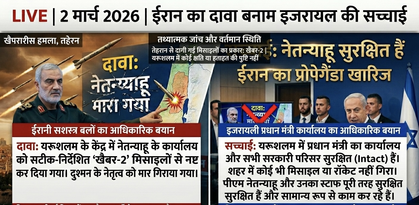 नई दिल्ली/यरूशलम (2 मार्च 2026): सोशल मीडिया और ईरानी मीडिया में इजरायल के प्रधानमंत्री बेंजामिन नेतन्याहू की मौत को लेकर चल रही खबरें पूरी तरह से भ्रामक और ‘फेक न्यूज़’ (Fake News) साबित हुई हैं। इजरायल सरकार ने इन दावों का सख्त खंडन किया है और पुष्टि की है कि पीएम नेतन्याहू पूरी तरह सुरक्षित हैं और अपना कामकाज सामान्य रूप से कर रहे हैं। क्या था ईरान का दावा? ईरान की सैन्य संस्था इस्लामिक रिवोल्यूशनरी गार्ड कॉर्प्स (IRGC) और वहां की सरकारी न्यूज़ एजेंसियों ने यह प्रोपेगैंडा फैलाया था कि उन्होंने इजरायल पर ‘खैबर’ मिसाइलों से एक सटीक और बड़ा हमला किया है। ईरानी मीडिया ने दावा किया कि इस हमले में यरूशलम स्थित नेतन्याहू के कार्यालय को निशाना बनाया गया और प्रधानमंत्री के बचने की संभावना नहीं है। इजरायल ने बताई सच्चाई इजरायली प्रधानमंत्री कार्यालय (PMO) ने तुरंत एक आधिकारिक बयान जारी कर ईरान के इन दावों को सिरे से खारिज कर दिया। इजरायल के अनुसार: • यरूशलम में प्रधानमंत्री का कार्यालय पूरी तरह से सुरक्षित (Intact) है। • वहां किसी भी प्रकार की कोई मिसाइल नहीं गिरी है। • पीएम नेतन्याहू आज (2 मार्च) सार्वजनिक रूप से एक्टिव नजर आए। उन्होंने सुरक्षा अधिकारियों के साथ उच्च स्तरीय बैठकें कीं और उन इलाकों का दौरा भी किया जहाँ मिसाइल हमले का अलर्ट जारी किया गया था। क्यों फैलाई जा रही है यह ‘फेक न्यूज़’? रक्षा विशेषज्ञों के अनुसार, यह ईरान की तरफ से चलाया जा रहा ‘मनोवैज्ञानिक युद्ध’ (Psychological Warfare) है। गौरतलब है कि बीते 28 फरवरी 2026 को अमेरिका और इजरायल ने मिलकर ईरान पर एक बड़ा सैन्य ऑपरेशन किया था, जिसमें ईरान के सर्वोच्च नेता अयातुल्ला अली खामेनेई की मौत हो गई थी। इस बड़ी क्षति के बाद से ही ईरान बैकफुट पर है। अपने देश की जनता और समर्थकों का मनोबल ऊंचा रखने और इजरायल में दहशत फैलाने के मकसद से ईरानी सेना इस तरह के झूठे दावों का सहारा ले रही है। फिलहाल मध्य पूर्व (Middle East) में हालात बेहद तनावपूर्ण बने हुए हैं, लेकिन इजरायली नेतृत्व पूरी तरह सुरक्षित और अलर्ट पर है। आम जनता से अपील की गई है कि वे सोशल मीडिया पर चल रही किसी भी अफवाह पर बिना आधिकारिक पुष्टि के विश्वास न करें। Share this: Share on Facebook (Opens in new window) Facebook Share on X (Opens in new window) X Like this:Like Loading... Post navigation फ़ैक्ट चेक: क्या ईरान की ‘फत्ताह’ मिसाइल ने इज़राइल का परमाणु संयंत्र तबाह कर दिया? जानें पूरा सच राष्ट्रपति ट्रंप की ईरान को अंतिम चेतावनी – “हथियार डालो या मौत के लिए तैयार रहो!”