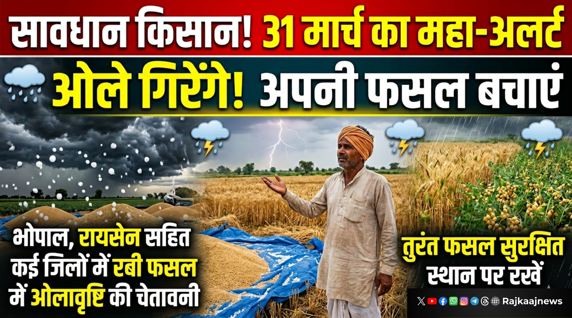 मौसम के अचानक बदलते मिजाज और पुणे में हुई भारी ओलावृष्टि के बाद, अब मध्य प्रदेश के किसानों की चिंताएं बढ़ गई हैं। मौसम विभाग (IMD) ने आज 31 मार्च को भोपाल, रायसेन, सीहोर और विदिशा सहित कई आसपास के जिलों में तेज हवाओं, गरज-चमक के साथ बारिश और ओले गिरने की चेतावनी जारी की है।