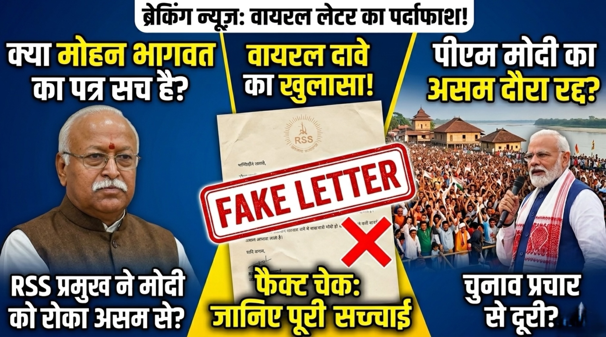 नई दिल्ली: सोशल मीडिया पर इन दिनों असम चुनावों को लेकर एक लेटर बहुत तेजी से वायरल हो रहा है। इस लेटर को लेकर दावा किया जा रहा है कि यह राष्ट्रीय स्वयंसेवक संघ (RSS) के प्रमुख मोहन भागवत ने प्रधानमंत्री नरेंद्र मोदी को लिखा है। वायरल लेटर में कथित तौर पर पीएम मोदी को असम में चुनाव प्रचार और रैलियां करने से मना किया गया है। जब इस लेटर की गहराई से पड़ताल की गई, तो सच्चाई कुछ और ही सामने आई। आइए जानते हैं इस वायरल दावे का 100% सच क्या है। क्या है वायरल लेटर का दावा? फेसबुक, व्हाट्सएप और X (पहले ट्विटर) जैसे अलग-अलग सोशल मीडिया प्लेटफॉर्म्स पर एक लेटर शेयर किया जा रहा है। इसमें RSS के लेटरहेड का इस्तेमाल किया गया है। दावा किया जा रहा है कि असम के राजनीतिक हालात को देखते हुए मोहन भागवत ने पीएम मोदी को वहां चुनाव प्रचार करने से बचने की सलाह दी है। फैक्ट चेक: लेटर की असली सच्चाई क्या है? हमारी पड़ताल में यह बात पूरी तरह से साफ हो गई है कि सोशल मीडिया पर वायरल हो रहा यह लेटर एकदम फर्जी (Fake) है। इसके पीछे की मुख्य बातें इस प्रकार हैं: 1. कंप्यूटर से एडिट किया गया लेटरहेड: वायरल हो रहे पत्र में जिस लेटरहेड और हस्ताक्षर (Signature) का इस्तेमाल किया गया है, वह असली नहीं है। उसे कंप्यूटर और एडिटिंग सॉफ्टवेयर की मदद से बड़ी चालाकी से तैयार किया गया है। 2. RSS की तरफ से कोई आधिकारिक पत्र नहीं: राष्ट्रीय स्वयंसेवक संघ (RSS) या मोहन भागवत जी की तरफ से ऐसा कोई भी पत्र प्रधानमंत्री कार्यालय (PMO) या प्रधानमंत्री नरेंद्र मोदी को नहीं भेजा गया है। यह दावा पूरी तरह से आधारहीन है। 3. भ्रम फैलाने की सोची-समझी साजिश: अक्सर चुनावों के समय कुछ असामाजिक तत्वों द्वारा फर्जी खबरें और झूठे लेटर वायरल किए जाते हैं। इसका मुख्य उद्देश्य जनता और वोटर्स के बीच भ्रम (Confusion) पैदा करना होता है। यह फर्जी लेटर भी उसी फेक न्यूज़ प्रोपेगेंडा का एक हिस्सा है। सोशल मीडिया पर किया जा रहा यह दावा पूरी तरह से झूठा है। मोहन भागवत जी ने पीएम मोदी को असम जाने से रोकने के लिए कोई भी पत्र नहीं लिखा है। हमारी आपसे अपील है कि इंटरनेट पर किसी भी वायरल लेटर या खबर पर बिना जांच किए भरोसा न करें। बिना सच्चाई जाने ऐसी भ्रामक जानकारियों को शेयर करने से बचें। सही और सटीक खबरों के लिए हमेशा विश्वसनीय न्यूज़ पोर्टल्स पर ही भरोसा करें। Share this: Share on Facebook (Opens in new window) Facebook Share on X (Opens in new window) X Like this:Like Loading... Post navigation सीएम हिमंत पर कांग्रेस का बड़ा आरोप: अगर विदेशी संपत्ति की बात सच निकली, तो क्या होगी जेल?