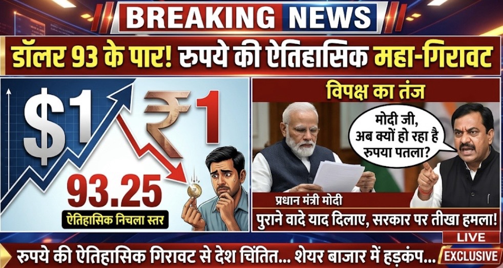 भारतीय अर्थव्यवस्था से आज की सबसे बड़ी और चौंकाने वाली खबर आ रही है। डॉलर के सामने हमारा रुपया बुरी तरह टूट गया है और अब तक के सबसे निचले स्तर पर जा गिरा है। आज 1 डॉलर की कीमत 93 रुपये के पार पहुंच गई है। रुपये की इस भारी गिरावट ने न सिर्फ शेयर बाजार को डरा दिया है, बल्कि देश की राजनीति में भी बड़ा भूचाल ला दिया है। विपक्ष को बैठे-बिठाए एक बड़ा मुद्दा मिल गया है और अब सीधे प्रधानमंत्री नरेंद्र मोदी निशाने पर हैं।